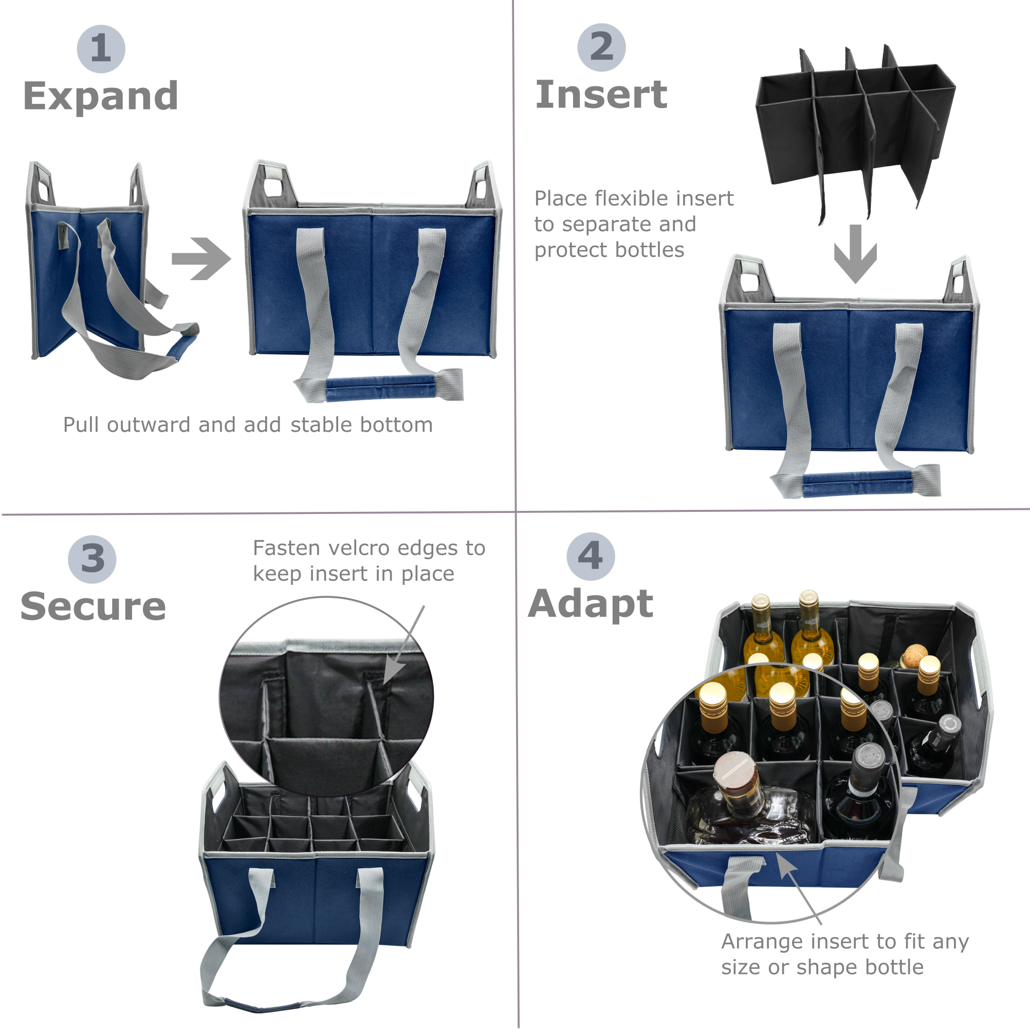 • Ultimate flexibility - Versatile insert protects 12 wine bottles or adapts to fit different sized bottles and food items. Sides velcro in place to ensure that your items don't shift in the bag